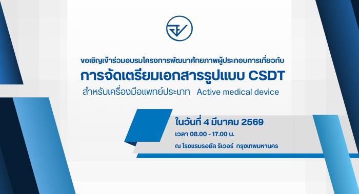 ขอเชิญเข้าร่วมอบรมโครงการพัฒนาศักยภาพผู้ประกอบการเกี่ยวกับแนวทางการจัดเตรียมเอกสารการยื่นคำขอการจัดเตรียมเอกสารรูปแบบ CSDT สำหรับเครื่องมือแพทย์ประเภท เครื่องมือแพทย์สำหรับการวินิจฉัยภายนอกร่างกาย (IVD)